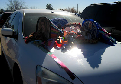 | Matachine headdresses on car while dancers eating lunch. Our Lady of Guadalupe Fiesta, Tortugas, New Mexico. |